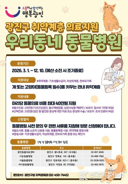 김경호 광진구청장은 “반려동물은 주민들에게 정서적 안정과 위로를 주는 소중한 가족이지만 경제적 이유로 제때 진료를 받지 못하는 경우가 많다”며 “이번 ‘우리동네 동물병원’을 통해 취약계층 반려동물이 기본 건강관리와 필요한 진료를 받을 수 있도록 지원하겠다”고 말했다.