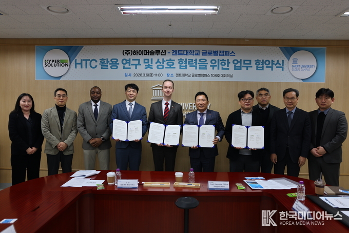 [ 한국미디어뉴스 이원영기자 ] 겐트대학교 글로벌캠퍼스와 (주)하이퍼솔루션은 6일 폐기물 관리, 재활용 및 순환 경제 분야 연구 협력을 위한 업무협약식을 진행했다.