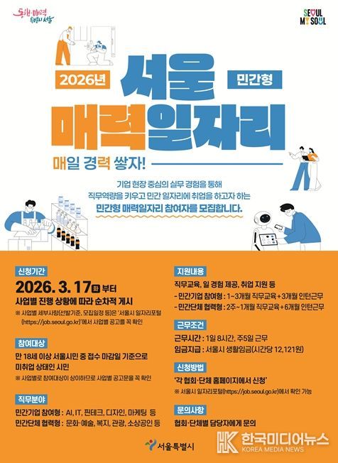 [ 한국미디어뉴스 이원영 기자 ] 서울시가 직무교육과 인턴십을 통해 민간 취업으로 연계하는 ‘서울 매력일자리 사업’ 참여자 1,980명을 모집한다. 올해는 지난해보다 규모를 230명 늘리고, 산업 전반의 AI 전환에 맞춰 생성형 AI 등 AI 활용 직무 교육도 확대한다.