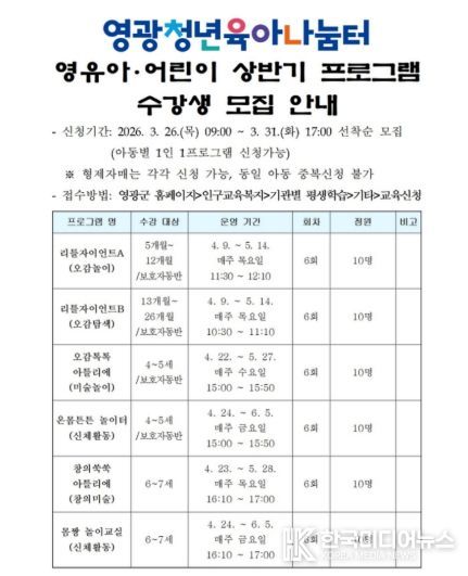 [ 한국미디어뉴스 이종철 기자 ] 영광군은 ‘영광청년육아나눔터’에서 영유아・어린이를 대상으로 하는 「2026년 상반기 프로그램」 수강생을 모집한다고 밝혔다.