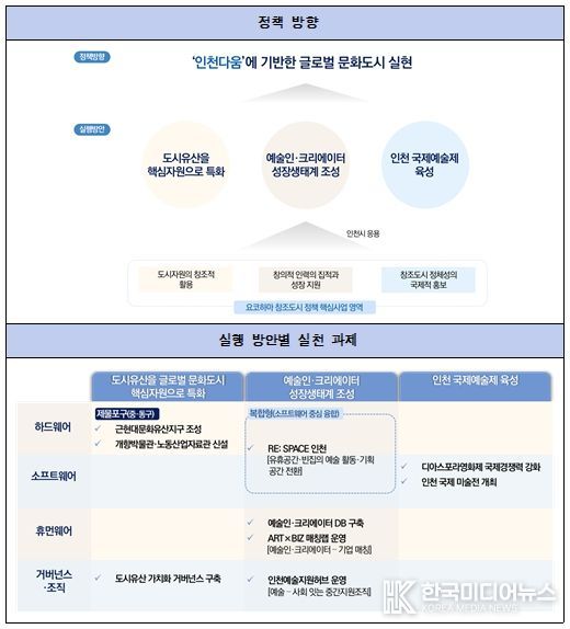 그리고 이러한 방향성 속에서 근현대 문화유산지구 조성, 인천개항도시박물관 및 인천노동산업자료관 신설, 도시유산 가치화 거버넌스 구축, 유휴공간의 예술적 전환, 예술인・크리에이터 DB 구축, 예술과 비즈니스를 연계한 ART×BIZ 매칭랩 운영, 인천예술지원허브 운영, 디아스포라영화제 국제 경쟁력 강화, 인천 국제 미술전 개최 등의 실천 과제를 제안했다.