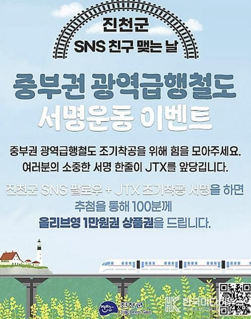 [ 한국미디어뉴스 김풍옥 기자 ] 충북 진천군이 ‘중부권 광역급행철도(JTX)’ 조기 착공을 위한 군민과 국민의 관심을 모으기 위해 오는 3월 29일까지 SNS 서명운동 참여 이벤트를 진행한다.