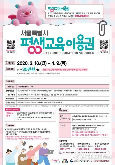 [ 한국미디어뉴스 이원영 기자 ] 서울 도봉구가 2026년 평생교육이용권 신청자를 4월 9일까지 접수한다.