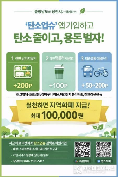 [ 한국미디어뉴스 이원영 기자 ] 당진시는 기후위기 대응을 강화하고 시민들의 자발적인 탄소중립 실천을 확산하기 위해 충남형 탄소중립포인트제 ‘탄소업슈’ 가입자 확대를 본격 추진한다고 19일 밝혔다.