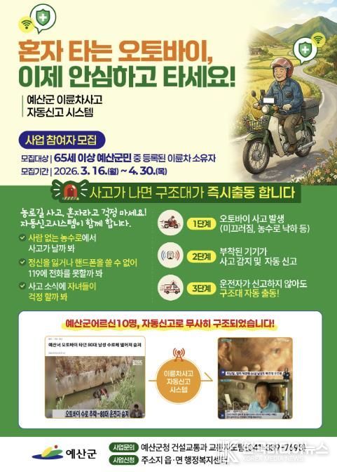 [ 한국미디어뉴스 이원영 기자 ] 예산군은 이륜차사고 발생 시 자동 신고를 통해 신속한 구조를 지원하는 ‘이륜차사고 자동신고 시스템 운영’ 사업을 추진한다.