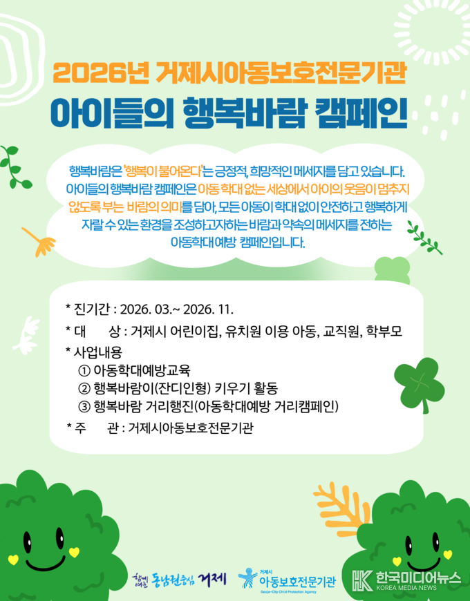 [ 한국미디어뉴스 이원영기자 ] 거제시아동보호전문기관(관장 이미희)은 거제시와 함께 2024년부터 ‘아이들의 행복바람 캠페인’을 추진하고 있다. 이 캠페인은 2026년 3월부터 11월까지 어린이집과 유치원을 대상으로 운영될 예정이다.