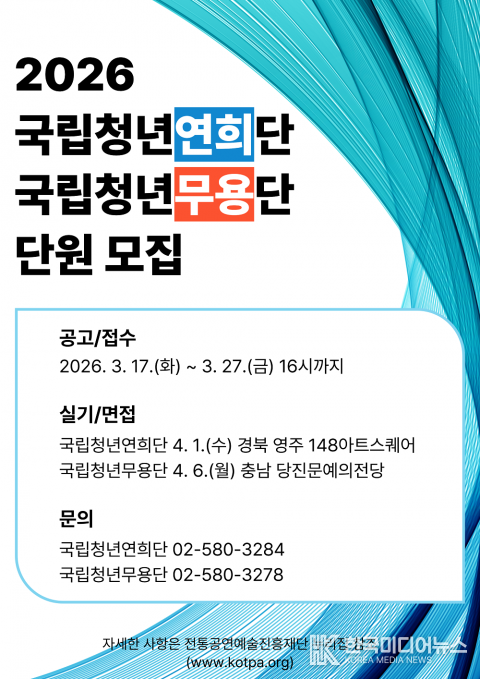 [ 한국미디어뉴스 이원영 기자 ] 2026년 3월 19일 -- 전통공연예술진흥재단(이사장 배영호)이 ‘국립청년연희단’과 ‘국립청년무용단’ 2기 신규 단원을 모집한다.