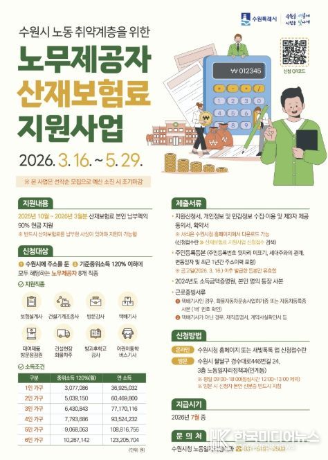 [ 한국미디어뉴스 김일규 기자 ] 수원특례시는 5월 29일까지 ‘2026년 상반기 노동 취약계층 노무제공자 산재보험료 지원사업’ 신청을 받는다.
