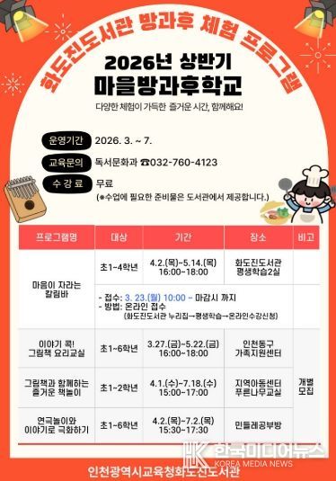 [ 한국미디어뉴스 이원영 기자 ] 인천광역시교육청화도진도서관은 3월부터 7월까지 초등학생을 대상으로 ‘2026학년도 상반기 마을방과후학교’프로그램을 운영한다.