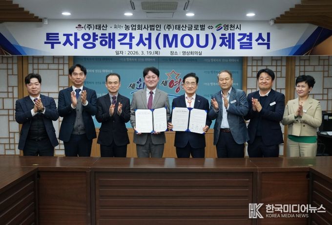 [ 한국미디어뉴스 이보영 기자 ] 영천시는 19일 시청 영상회의실에서 ㈜태산과 농업회사법인 ㈜태산글로벌과 220억원 규모의 투자협약(MOU)을 체결했다.