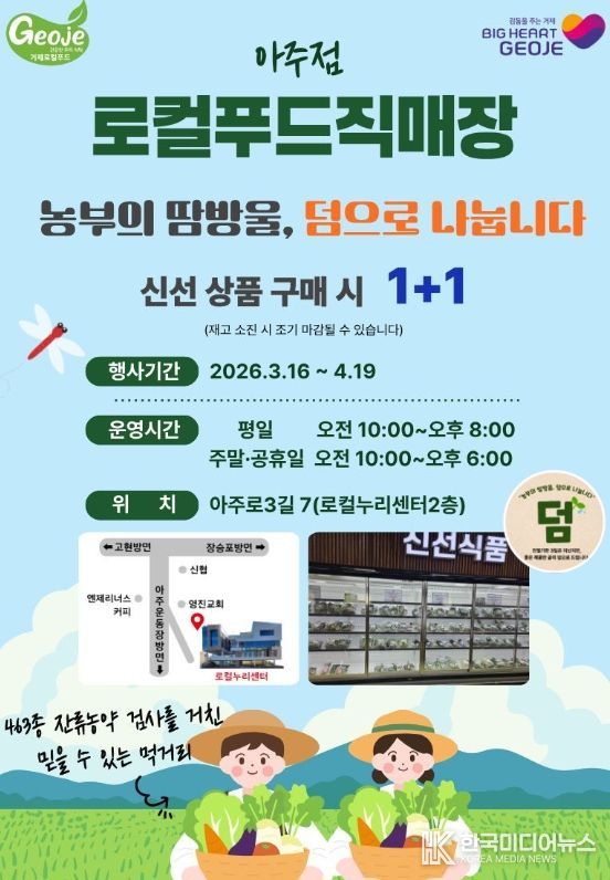 [ 한국미디어뉴스 김홍철 기자 ] 거제시는 지난 16일부터 오는 4월 19일까지 약 1개월간 거제로컬 누리센터 아주점에서 농가의 재고 부담을 덜고 소비자에게는 혜택을 제공하는 『농부의 땀방울, 덤(1+1)으로 나눕니다』 행사를 시범 운영한다고 밝혔다.
