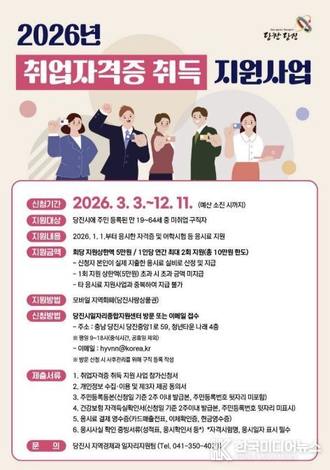 [ 한국미디어뉴스 이원영 기자 ] 당진시는 시민들의 취업 역량 강화를 위해 ‘2026년 취업 자격증 취득 지원사업’을 추진하고 지원 대상자를 모집한다고 20일 밝혔다.