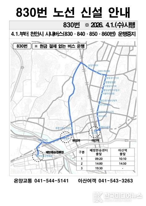 △ 830번: 배방환승정류장-탕정역-삼일원앙아파트-천안시청앞사거리-아산역(왕복 2.5회 운행)