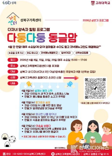 이승로 성북구청장은 “다자녀 양육자들이 서로 공감하고 응원할 수 있는 돌봄공동체 형성에 도움이 되길 바란다”며 “앞으로도 다양한 가족 유형을 지원하는 프로그램을 지속적으로 운영하겠다”고 말했다.