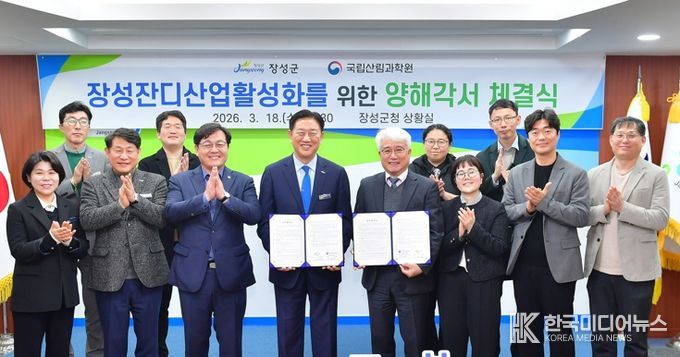 [ 한국미디어뉴스 이종철 기자 ] 장성군과 국립산림과학원이 18일 군청 상황실에서 잔디산업 활성화를 위한 업무협약을 체결했다. 협약식에는 김한종 장성군수, 권순덕 국립산림과학원 산림바이오소재연구소연구소장 등 관계자 10여 명이 참석했다.