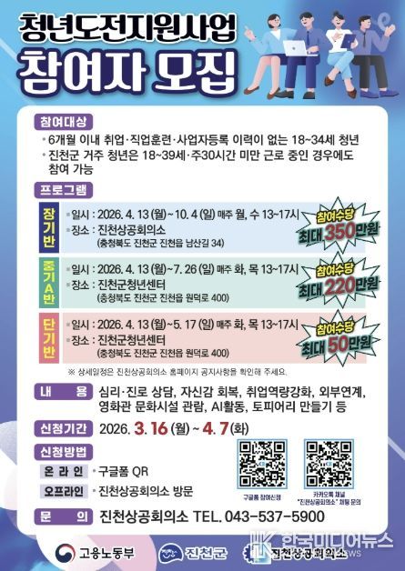 [ 한국미디어뉴스 김풍옥 기자 ] 충북 진천군은 ‘2026년 청년도전지원사업’ 참여자를 모집한다고 밝혔다.