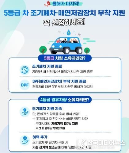 또한 배출가스 5등급 경유차에 매연 저감장치(DPF)를 설치하면 설치비의 약 90%를 지원하며, 건설기계(덤프트럭) 매연 저감장치 설치와 지게차·굴삭기·롤러·로더 엔진 교체 비용은 전액 지원한다.