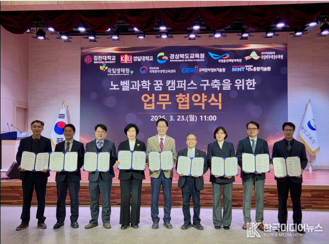 [ 한국미디어뉴스 이원영기자 ] 국립울진해양과학관(관장 김외철)은 3월 23일 경상북도교육청, 경일대학교, 김천대학교, 국립백두대간수목원, 국립생태원 멸종위기종복원센터, 국립종자원 국제종자생명교육센터, 구미전자정보기술원, 포항공과대학교 나노융합기술원과 함께 ‘노벨과학꿈캠퍼스’ 학교 밖 교육 운영을 위한 업무협약을 체결했다.