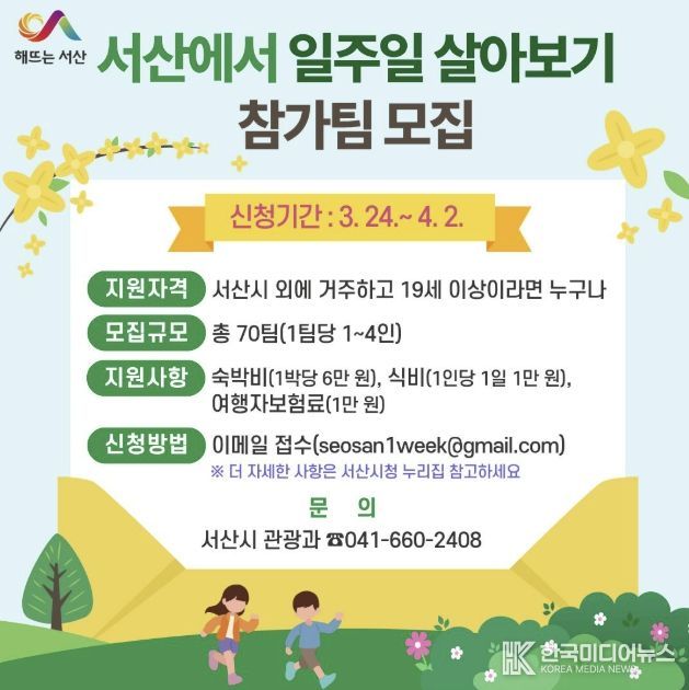 [ 한국미디어뉴스 이원영 기자 ] 충남 서산시가 3월 24일부터 4월 2일까지 ‘서산에서 일주일 살아보기’ 참가팀을 모집한다고 밝혔다.