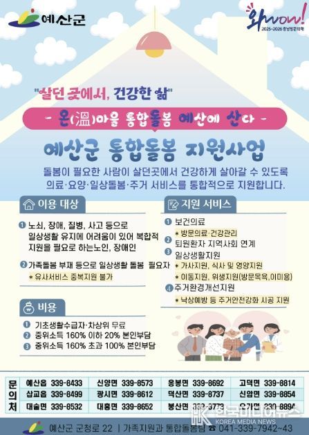 [ 한국미디어뉴스 이원영 기자 ] 예산군은 돌봄이 필요한 군민이 살던 곳에서 의료·요양·돌봄 서비스를 통합적으로 지원받을 수 있도록 ‘의료·요양 통합돌봄사업’을 3월 27일부터 본격 추진한다.