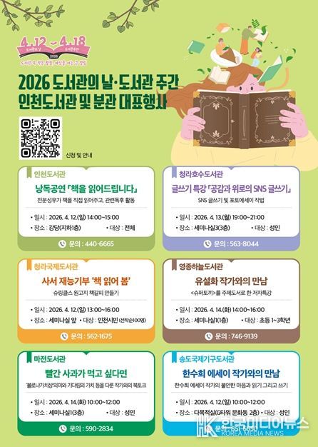 [ 한국미디어뉴스 이원영 기자 ] 인천광역시인천도서관은 도서관의 날(4월 12일) 및 도서관 주간(4월 12일~4월 18일)을 맞아 인천도서관과 각 분관에서 시민과 함께하는 다양한 독서문화 행사를 운영한다고 밝혔다.