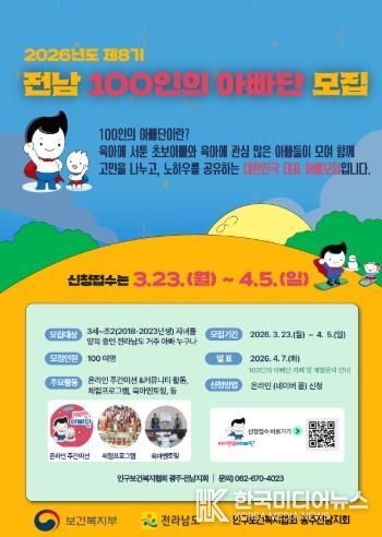 [ 한국미디어뉴스 이종철 기자 ] 전라남도는 아빠의 육아 참여를 확대하고 가족 중심의 건강한 양육문화를 확산하기 위해 2026년 제8기 전남 100인의 아빠단 참여자를 모집한다.