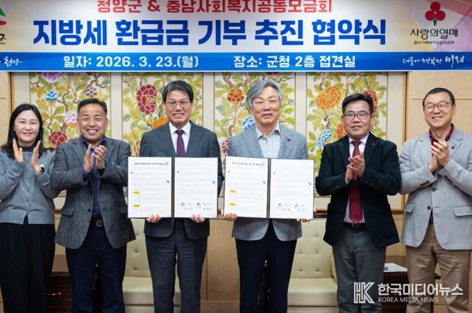 [ 한국미디어뉴스 이원영 기자 ] 청양군이 찾아가지 않은 소액 지방세 환급금을 어려운 이웃을 위한 기부금으로 활용하는 ‘지방세 환급금 기부 추진’ 업무협약을 체결했다.