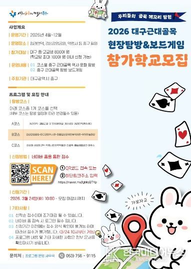 [ 한국미디어뉴스 이보영 기자 ] 대구 중구는 3월부터 지역 청소년들이 우리 지역의 역사와 문화를 친숙하고 재미있게 체험할 수 있는 2026년 근대골목 보드게임 탐방 프로그램을 운영한다.