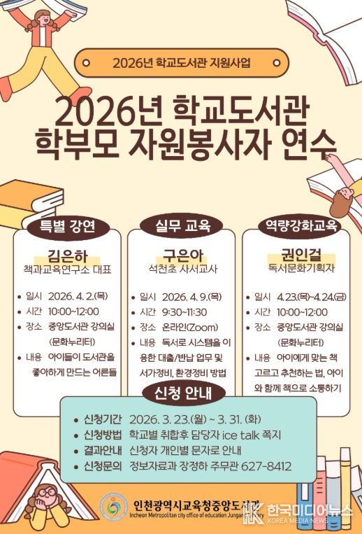 [ 한국미디어뉴스 이원영 기자 ] 인천광역시교육청중앙도서관은 학교도서관 학부모 자원봉사자들의 전문성을 높이고 자녀와의 소통 능력을 함양하기 위해 ‘2026년 학교도서관 학부모 자원봉사자 연수’를 운영한다.