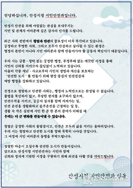 [ 한국미디어뉴스 이보영 기자 ] 안성시는 각종 안전점검 과정에서 청렴 안내문을 배부하는 ‘청렴한 안전점검’을 추진하며 시민 청렴의식 제고에 나선다.