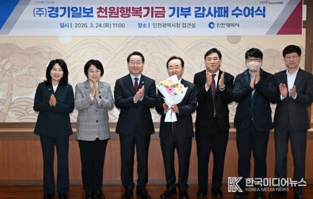 [ 한국미디어뉴스 이원영 기자 ] 인천광역시는 3월 24일 시청 접견실에서 인천 문화예술 진흥을 위한 ‘천원행복기금’ 민간 1호 기탁자인 ㈜경기일보와 김기태 인천본부 사장에게 감사패를 수여했다고 밝혔다.
