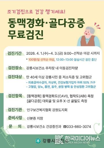 [ 한국미디어뉴스 이원영 기자 ] 강릉시보건소는 오는 4월 1일부터 3일까지 인구보건복지협회 강원도지회와 연계하여 동맥경화 및 골다공증 무료검진을 실시한다.