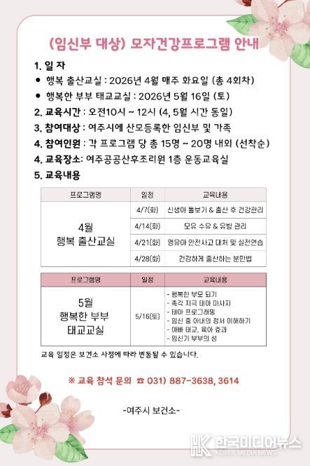 [ 한국미디어뉴스 이원영 기자 ] 여주시 건강증진과는 관내 임산부가 출산에 대한 전반적인 지식과 기술을 습득하여 건강하고 행복한 출산이 되도록 2026년도 상반기 '출산준비교실' 운영한다.