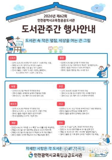 [ 한국미디어뉴스 이원영 기자 ] 인천광역시교육청 공공도서관은 제62회 도서관주간을 맞아 4월 한 달간 ‘도서관 속 작은 펼침, 세상을 여는 큰 열림’을 주제로 다양한 독서문화행사를 운영한다.