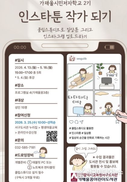 [ 한국미디어뉴스 이원영 기자 ] 인천광역시교육청서구도서관은 지역 주민의 창작 활동을 지원하기 위해, 25일부터 가재울 시민저자학교 2기 프로그램인 ‘인스타툰 작가되기’ 참여자를 모집한다.