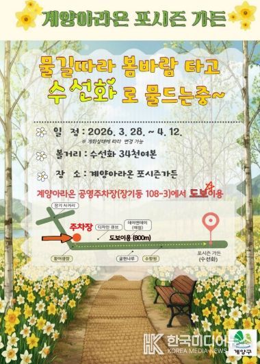 [ 한국미디어뉴스 이원희 기자 ] 인천광역시 계양구는 봄을 맞아 계양아라온 일대에 대규모 꽃 식재를 완료하고, 포시즌가든을 중심으로 수선화가 개화하기 시작하며 화사한 봄 경관을 선보이고 있다고 밝혔다.