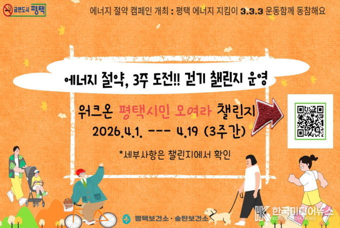 [ 한국미디어뉴스 이보영 기자 ] 평택시는 최근 중동 사태 장기화에 따른 국제 유가 상승 등 에너지 위기 상황을 극복하고, 시민 주도의 실천 문화를 확산하기 위해 오는 4월 1일부터 19일까지 3주간“‘에너지 절약, 걷기 챌린지”를 운영한다고 밝혔다.