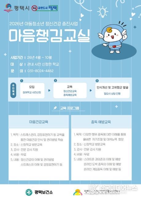 [ 한국미디어뉴스 이보영 기자 ] 평택시는 스쿨케어 사업의 일환으로 관내 학교 학생들을 대상으로 『마음챙김교실』을 운영한다고 밝혔다. 이번 프로그램은 학생들이 교육을 통해 정신건강을 올바르게 인식하고 스스로 관리할 수 있도록 지원함으로써 마음 건강 증진을 도모하는 데 목적이 있다.