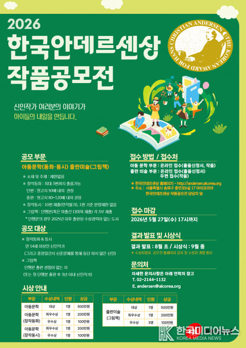 [ 한국미디어뉴스 이원영 기자 ] 2026년 3월 25일 -- 아이코리아(이사장 김태련)는 어린이 문화·예술 콘텐츠 발전과 신인 작가들의 창작 의욕을 북돋우기 위해 ‘2026 한국안데르센상 작품공모전’을 실시한다고 밝혔다.