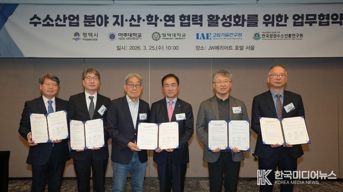 [ 한국미디어뉴스 이보영 기자 ] 평택시는 25일, 아주대학교·평택대학교·고등기술연구원·한국청정수소진흥연구원과 '수소산업 분야 지산학연 협력 활성화를 위한 업무협약(MOU)'을 체결했다고 밝혔다.