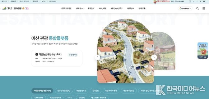 [ 한국미디어뉴스 이원영 기자 ] 예산군은 2026년 충남 방문의 해를 맞아 관광객 편의성과 접근성을 높이기 위해 ‘관광통합플랫폼’을 구축하고 3월 26일부터 시범운영을 시작해 4월 1일부터 정식 운영한다고 밝혔다.
