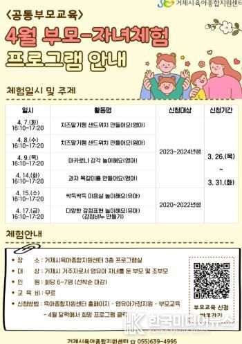 [ 한국미디어뉴스 김홍철 기자 ] 거제시육아종합지원센터는 영유아 가정을 대상으로 공통부모교육 부모-자녀체험 활동 4월 참여자를 3월 26일부터 31일까지 모집한다고 밝혔다.