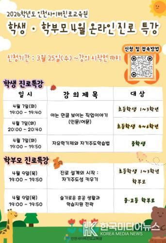 [ 한국미디어뉴스 이원영 기자 ] 인천광역시교육청은 오는 4월 7일과 9일, 관내 학생과 학부모를 대상으로 인천사이버진로교육원 ‘4월 온라인 진로특강’을 운영한다고 26일 밝혔다.