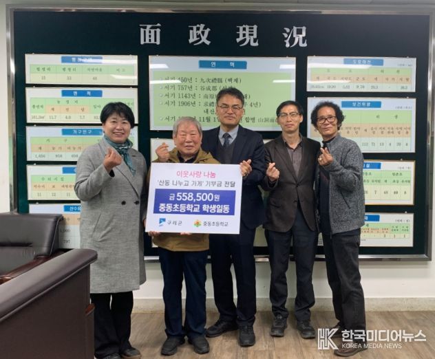 [ 한국미디어뉴스 이종철 기자 ] 구례군 산동면은 지난 25일, 산동면사무소에서 중동초등학교 학생들이 마련한 성금 55만8,500원을 산동면지역사회보장협의체(민간위원장 유영만)에 전달했다고 밝혔다.