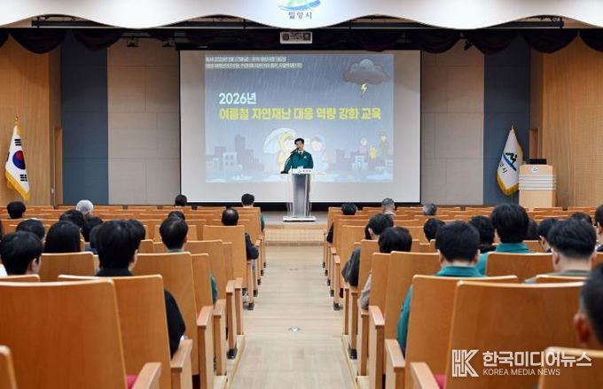 [ 한국미디어뉴스 최정화 기자 ] 경남 밀양시는 다가오는 여름철 풍수해 등 자연재난에 선제적으로 대응하고, 시민의 소중한 생명과 재산을 보호하기 위해 27일 시청 대강당에서 ‘여름철 자연재난 대응 역량 강화 교육’을 실시했다.