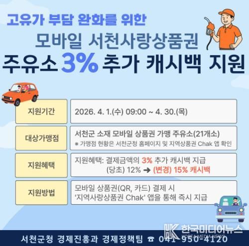지원 대상 가맹점은 서천군 관내 21개 주유소로, 해당 주유소에서 모바일 서천사랑상품권으로 결제할 경우 ‘지역사랑상품권 Chak’ 앱을 통해 결제금액의 3%를 추가 캐시백으로 지급한다.