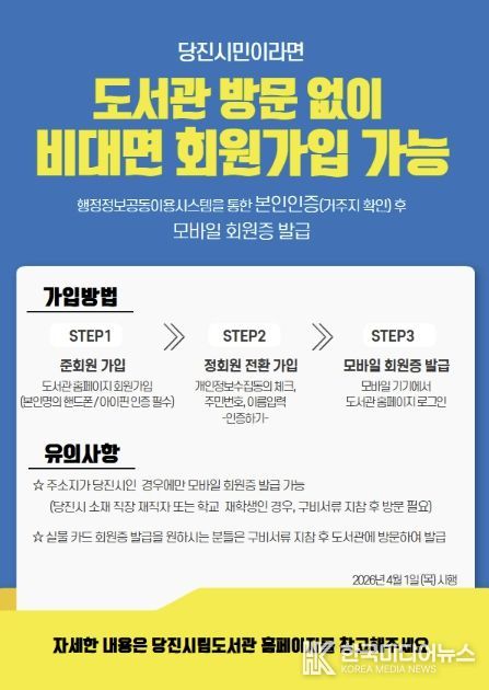 [ 한국미디어뉴스 이원영 기자 ] 당진시는 시민들이 도서관을 직접 방문하지 않고도 컴퓨터나 스마트폰을 통해 간편하게 회원 가입을 할 수 있는 ‘비대면 회원 가입 및 모바일 회원증 발급 서비스’를 4월 1일부터 본격 시행한다고 밝혔다.