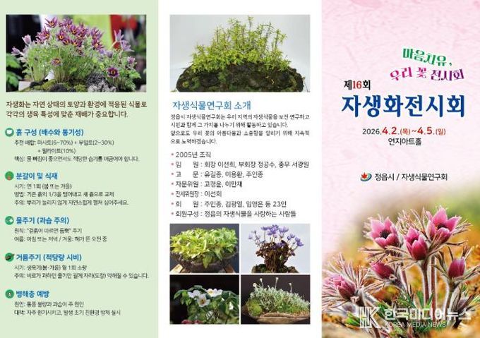 [ 한국미디어뉴스 이종철 기자 ] 정읍시 자생식물연구회가 오는 4월 2일부터 5일까지 나흘간 연지아트홀에서 100여 점의 아름다운 야생화를 선보이는 ‘마음의 치유 우리 꽃 전시회’를 개최한다.