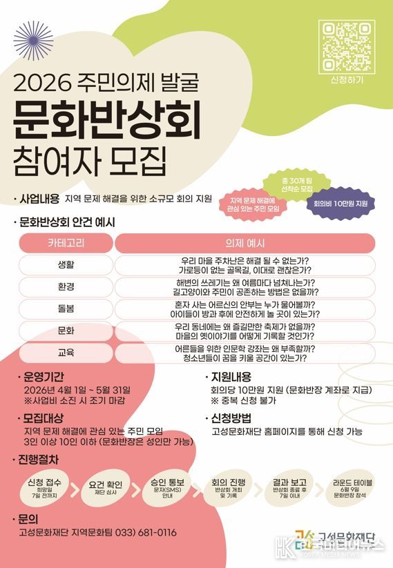 [ 한국미디어뉴스 이원영 기자 ] 고성문화재단은 주민 스스로 지역의 문제를 진단하고 대안을 모색하는 2026 주민의제 발굴 '문화반상회' 참여 모임을 오는 4월 1일 수요일부터 5월 31일 일요일까지 모집한다.