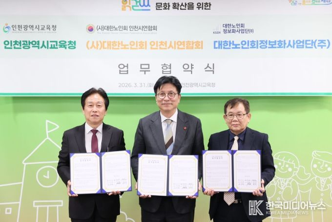 [ 한국미디어뉴스 이원영 기자 ] 인천광역시교육청은 31일 (사)대한노인회 인천광역시연합회, 대한노인회 정보화사업단과 ‘읽걷쓰 시민문화 확산을 위한 업무협약’을 체결했다.